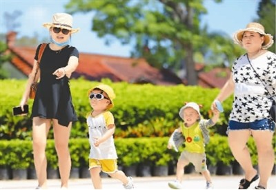 據文化和旅游部的統計數據,5月1日至5日,全國共接待國內游客1.15億人次,實現國內旅游收入475.6億元。圖為5月5日,家長帶孩子在海南三亞南山文化旅游區游覽。 陳文武攝(人民視覺)