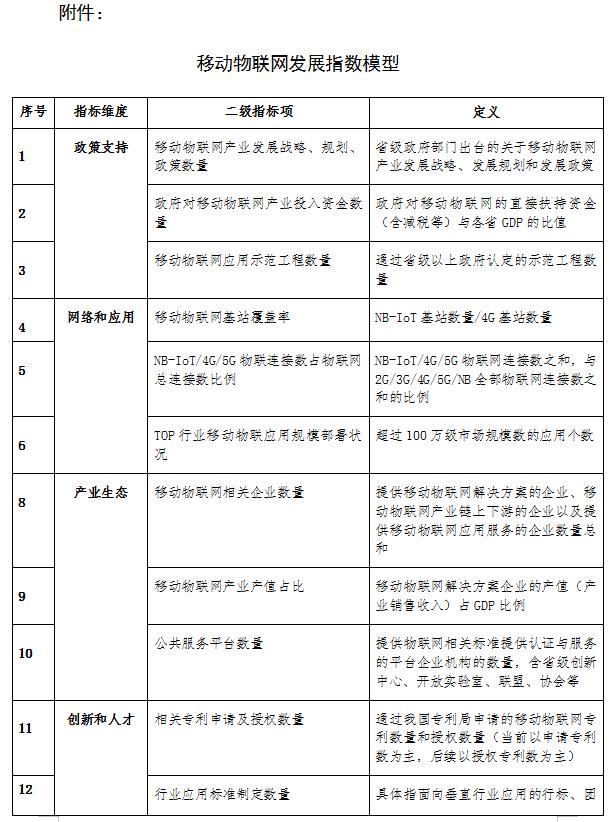 (二)開展發展水平評估。建立移動物聯網發展指數模型(附件),完善數據統計和信息采集機制,統一數據統計口徑,跟蹤監測移動物聯網產業發展基本情況,編制移動物聯網發展報告。客觀衡量和評價移動物聯網產業發展水平,充分激發各方發展移動物聯網的動力。