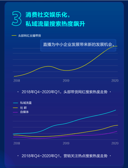 自2018年4季度以來,“頭部帶貨網紅”等與直播相關內容的搜索熱度持續走高。《報告》指出,直播等新業態的出現,也給中小企業的數字化升級指出了更明確的路線和目標:加入大平臺的生態閉環,中小企業獲得的賦能效應將更為顯著。