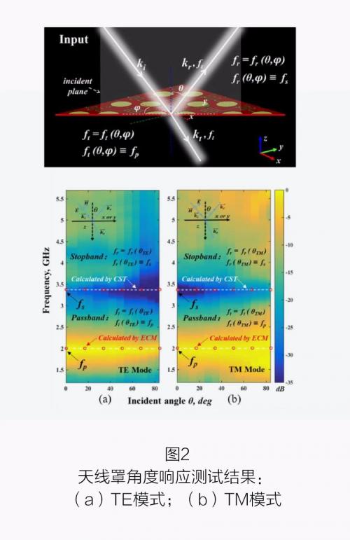 課題團隊對該天線罩模型進行了加工,通過自由空間測試方法,在微波暗室對該模型進行了測試,其不同入射角度下的傳輸響應如圖 2 所示。在 2 千兆赫處形成通帶,可以使得天線工作信號以很低的損耗通過天線罩,而對 3.4 千兆赫附近的信號則具有很強的抑制作用,實現對雜散信號的屏蔽。同時可以發現在 0~84 度(最理想為 90 度)的角度范圍內實現傳輸零點和傳輸極點對入射角度、極化角度的不敏感。