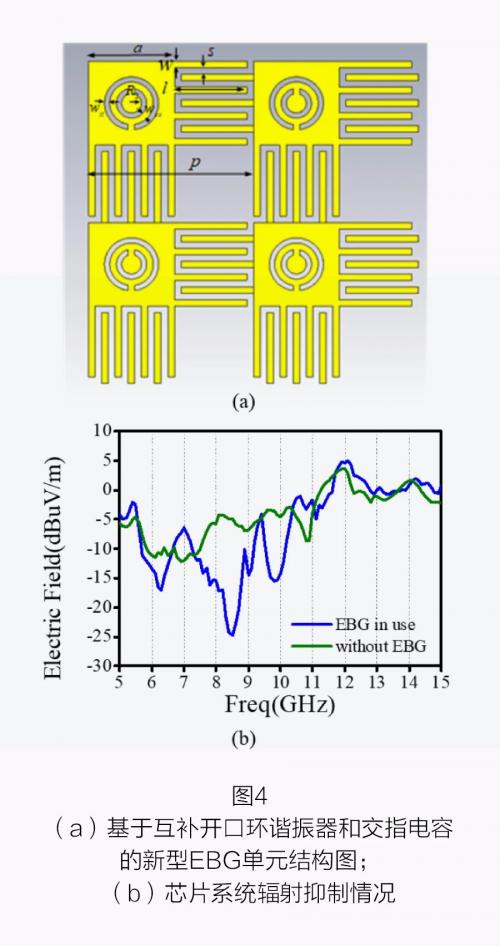 針對 5G 通信芯片系統中的電磁干擾問題,課題團隊提出基于互補開口環諧振器和交指電容的新型 EBG 結構以及基于超表面的吸收體結構,分別如圖 3 和圖 4 所示。它們的厚度可以做到小于 1 毫米,在 10 千兆赫處的吸收性能均可達到 5 分貝以上,這為其在芯片系統中的應用提供了可能。
