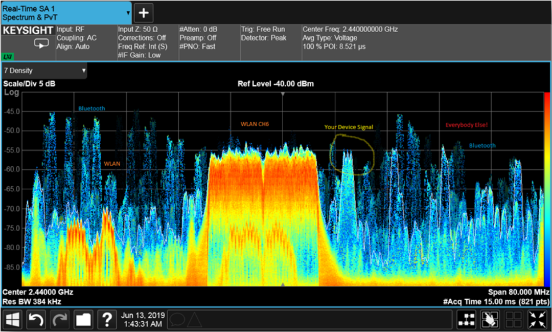 下圖是用是德科技的信號分析儀捕獲的在中心頻率為2.4G帶寬為80M的信號的分布情況。在如此擁擠的射頻環境中,醫療電子設備能夠正常工作嗎?這個擔心促使美國FDA聯合其他機構作了相關的研究,并制定了相應的指導性的測試規范。