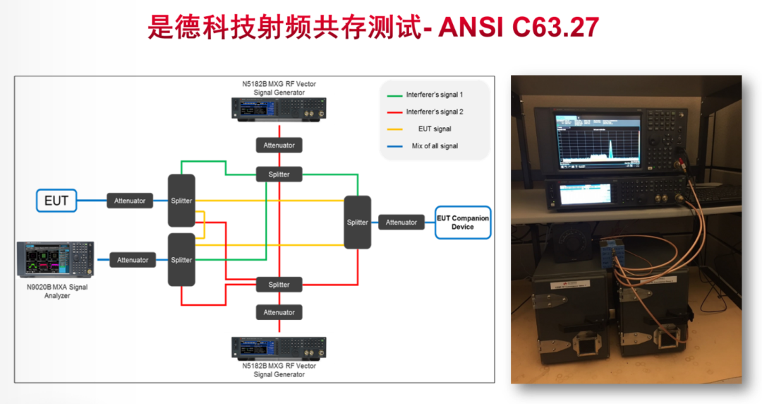 以下是利用是德科技的信號源MXG和信號分析儀MXA以及一些輔助設備,根據ANSI C63.27規范的建議搭建的共存測試的系統,右半部分是實際的設備圖片。