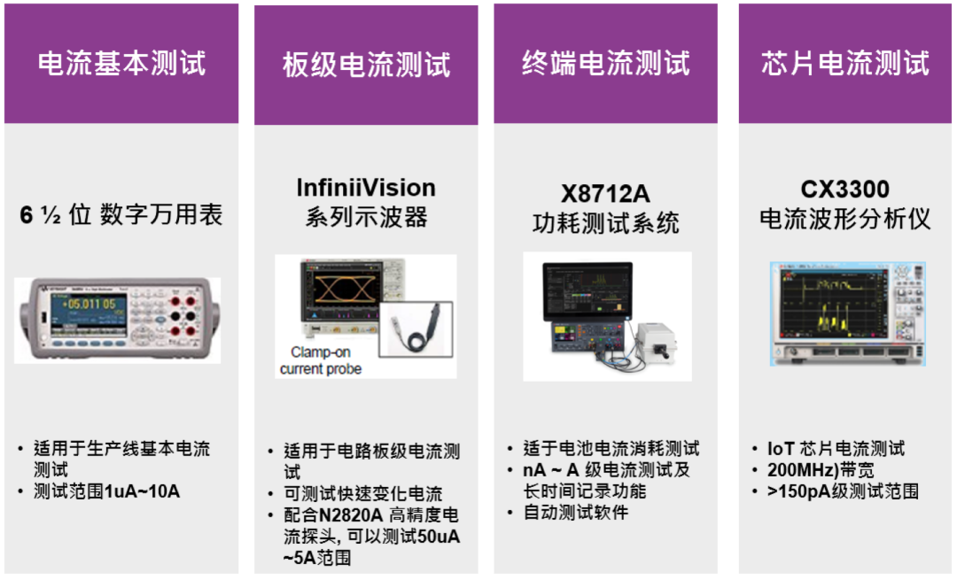 那就需要根據測試對象和測試要求,選取最適合的測試方案。例如,萬用表只適合測試靜態電流,因為它的帶寬大概只有10kHz的帶寬;而示波器可以測試動態范圍較大的電流,根據其連接方式,更適用于板級電流測試和局部電路電流的評估。CX3300電流波形分析儀采用了是德科技的專有探頭技術,可以測試低至150pA的電流,且動態范圍較寬,更適合物聯網的芯片或內存的功耗評估。