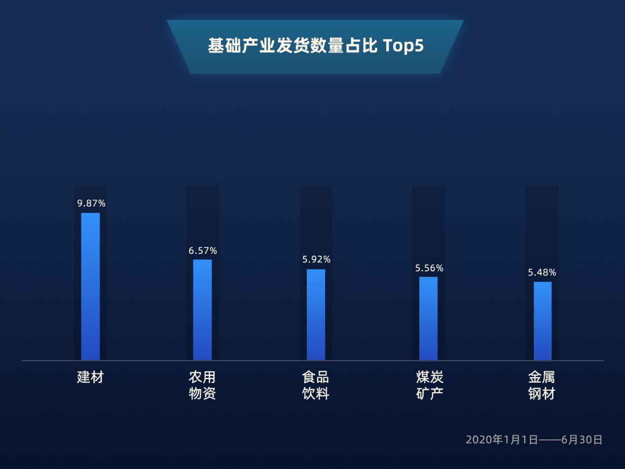2020年1月1日至6月30日,滿幫貨運平臺數據顯示,在基礎產業的貨物類型中,以建材、煤炭礦產、金屬鋼材為代表的第二產業,排在上半年發貨數量的前列。以農用物資、木材苗圃、蔬菜為代表的第一產業貨品緊隨其后。