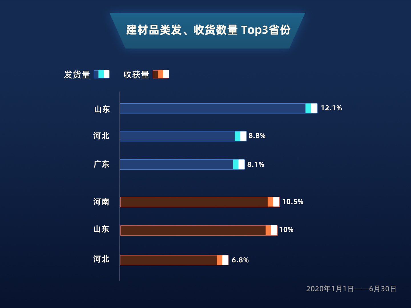 其中,建材訂單量占據基礎產業第一位,與去年同期相比,上升25.9%。根據國泰君安證券研究所已發布的研究報告分析,疫情對建材行業整體影響有限,原因是疫情對經濟形成沖擊后,基建將成為穩經濟的重要舉措。以山東省發貨數量排名第一、收貨數量排名第二,河北省發貨數量第二、收貨數量排名第三的數據來看,顯示了山東及河北兩省強健的生產能力,以及基礎建設需求旺盛的特點。