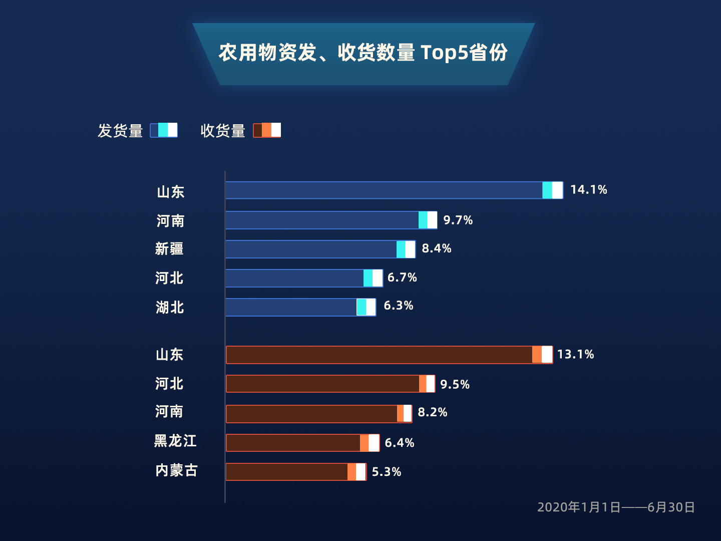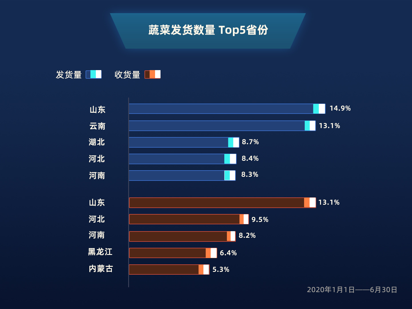 值得一提的是,年初疫情最為嚴峻的湖北省,在恢復生產后,依然躋身農用物資發貨數量top5,同時在貨運平臺上蔬菜的發貨數量中,以8.7%的占比位居第三。充分說明,遭遇疫情沖擊的湖北,已迅速恢復,在保障本省農業產品需求的同時,也具備向外省輸送到能力。
