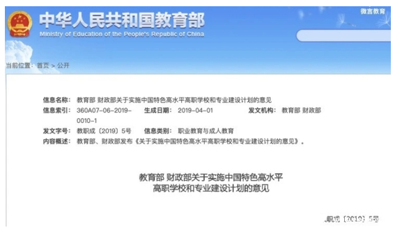 教育部、財政部聯合發布的《關于實施中國特色高水平高職學校和專業建設計劃的意見》:該文件提出要提高學校信息化水平,提升師生信息素養,建設智慧課堂和虛擬工廠,廣泛應用線上線下混合教學,促進自主、泛在、個性化學習。