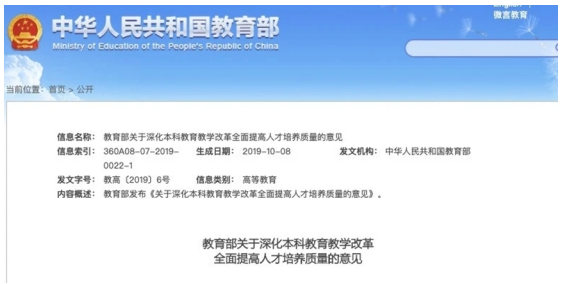 教育部發布的《關于深化本科教育教學改革 全面提高人才培養質量的意見》:文件指明要全面提高課程建設質量,積極發展“互聯網+教育”、探索智能教育新形態,推動課堂教學革命。