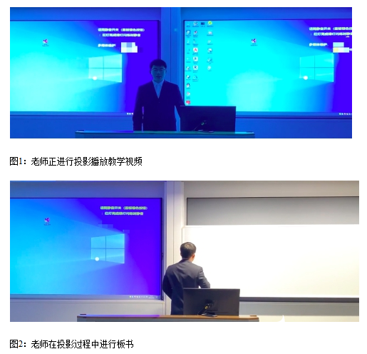 例如,老師在教學視頻播放到一半時想通過板書來加深學生們的印象,在這種情況下,老師只需把黑板拉出來,激光投影儀便會自動關閉,黑板燈也會自動打開,就可進行板書了。在板書完畢后,只需要把黑板恢復原位,相關設備將會自動恢復到放映前狀態,影片可無縫銜接放映。如圖1和圖2所示,老師正在播放教學視頻和板書。