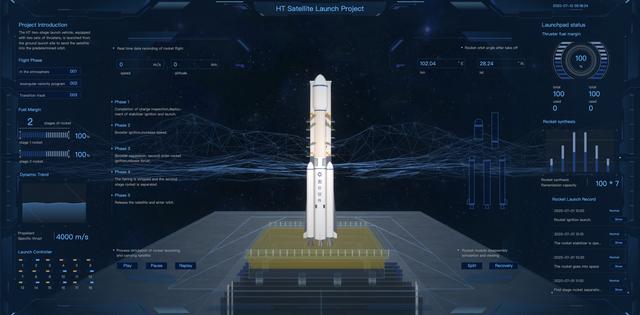中心的是 3D 場景,兩側數據是由 2D 面板組成,可 360 度旋轉、平移和縮放場景。數據面板展示了火箭以及衛星的一些相關模擬信息。