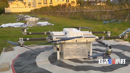 在距離安吉縣300多公里外的舟山群島,《經濟半小時》記者記錄了一場無人機帶貨測試。代號為“方舟七零”的一個無人機,軸距兩米五,貨艙6.3升,最大載重量10公斤,有8只螺旋槳,裝有4塊電池。