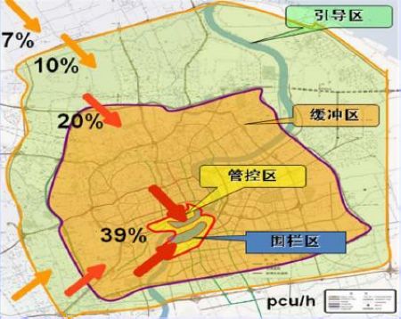 道路交通聯動誘導服務系統在對世博會車流和客流特征監控和協調世博園區和相關世博會通道、周邊其他道路、車輛、公交、軌道和停車設施的基礎上,利用信息技術手段,對市域范圍,乃至長三角范圍內的道路交通系統進行聯動誘導,保障世博會期間道路交通的安全、均衡和通暢。該系統通過對通往世博園的地面道路、城市快速路、高速公路進行聯動誘導,通過可變情報板和車道信號燈,在世博會專用車道和道路實行世博園方向早晚高峰時段單向或主要方向優先通行。公交專線巴士、世博會VIP車輛、緊急車輛在世博會專用車道上優先通行。