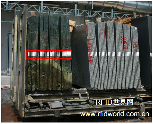 每塊成品石板邊緣粘貼一張 EPC Gen 2 RFID 小標簽