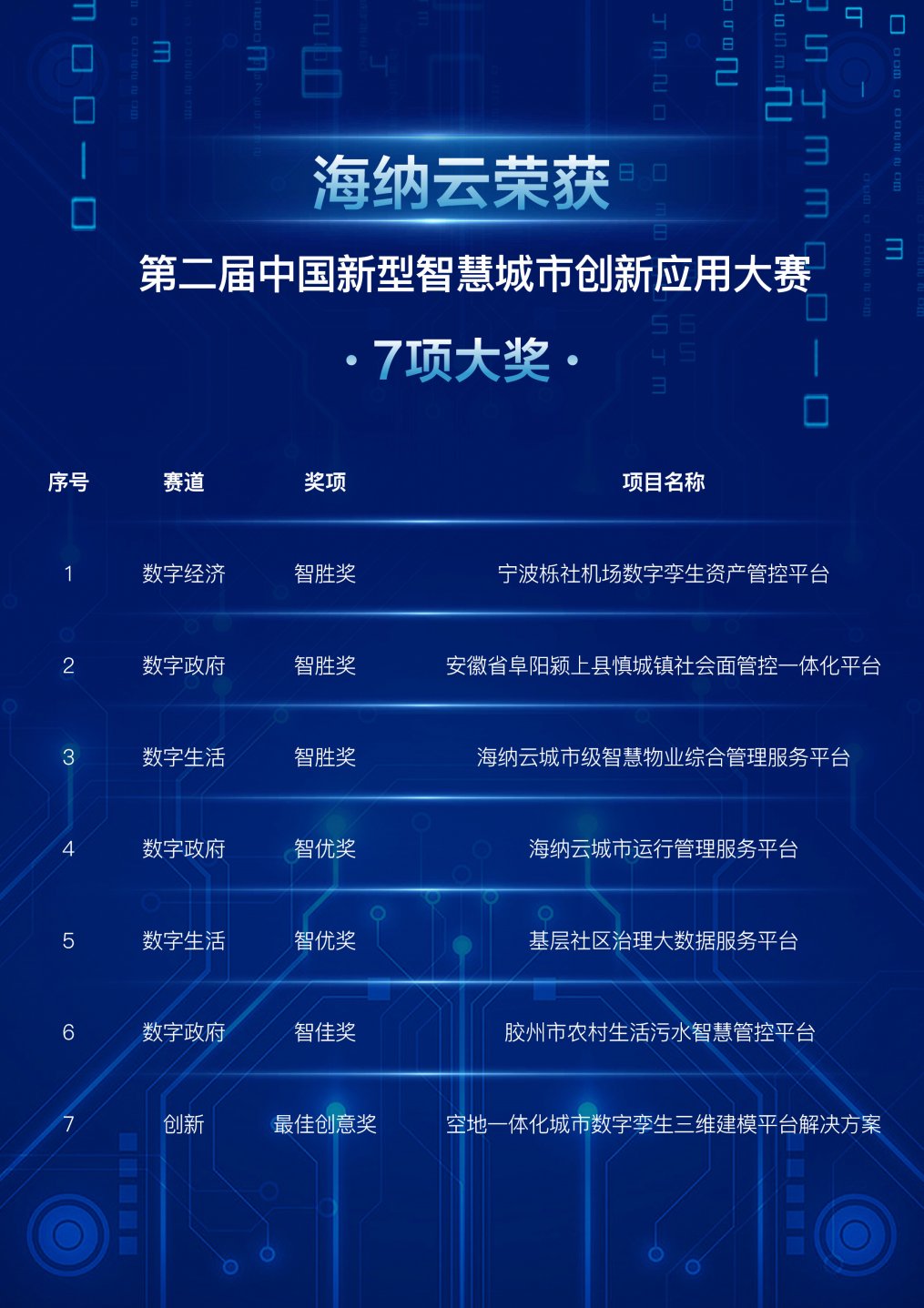 ▲海納云榮獲“第二屆中國新型智慧城市創新應用大賽”七項大獎