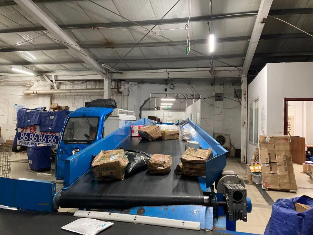 院子里,有一排藍白色的平房,和一片空曠的場地。場地停放了約50輛快遞配送三輪車,一輛廂式物流車正在卸貨;而平房內部,最顯眼的是一條L型的傳送帶式分揀線。