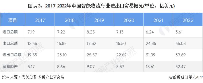 2022 年,我國智能物流行業進出口總額達 39.69 億美元,實現貿易順差 32.47 億美元。