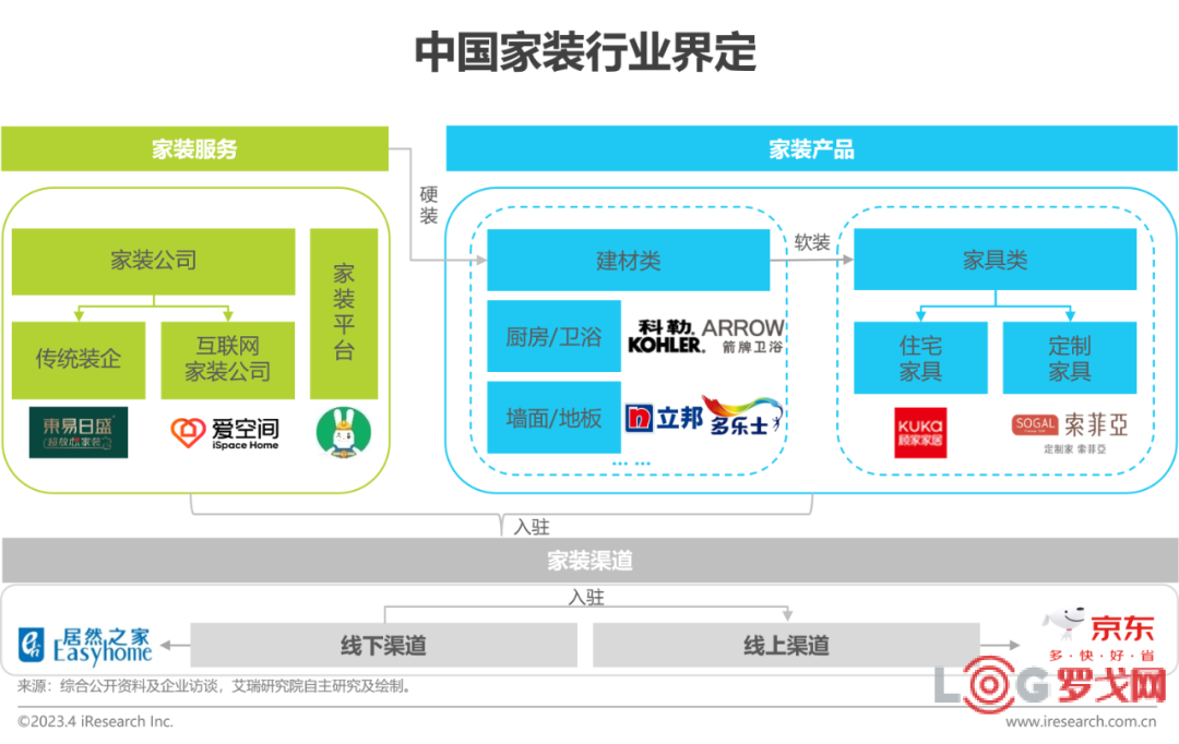 中國家裝行業按照服務模式及產品形態可分為服務型、產品型以及渠道型三類玩家。服務型玩家指家裝服務商,以提供家裝服務為主;產品型玩家指產品品牌商,以生產及售賣家裝產品為主,包括硬裝材料和軟裝產品;渠道型玩家指家裝服務及家裝產品的售賣渠道,包括以居然之家為代表的線下渠道和以京東家居家裝為代表的線上渠道。