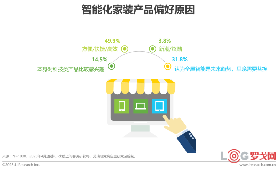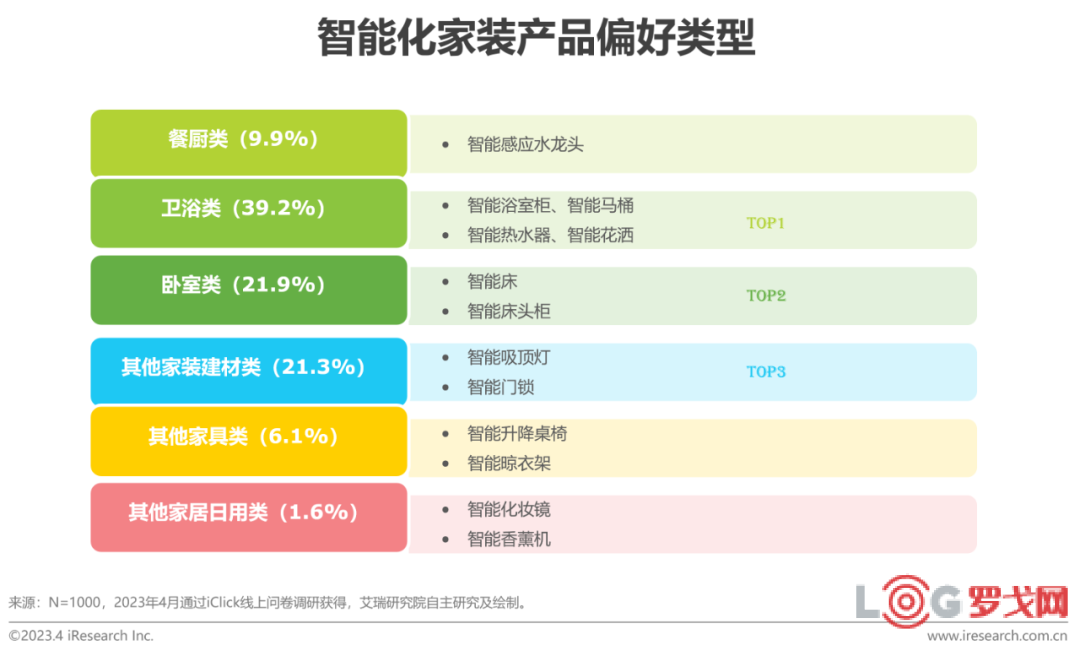 研究表明,我國家裝用戶偏向性最強的的三類智能化家裝產品分別為衛浴類產品(智能馬桶/智能花灑等)、臥室類產品(智能床等)以及其他家裝建材(智能燈具/智能門鎖等),占比分別為39.2%、21.9%和21.3%。這幾類家裝產品都屬于家中使用頻率較高且其智能化功能可以有效提高使用便捷性,從而充分釋放雙手,尤其適合“懶人”操作。接近一半的消費者選擇智能化家裝產品主要是從功能實用性的角度考慮,即可以使家中生活變得更加高效便捷。