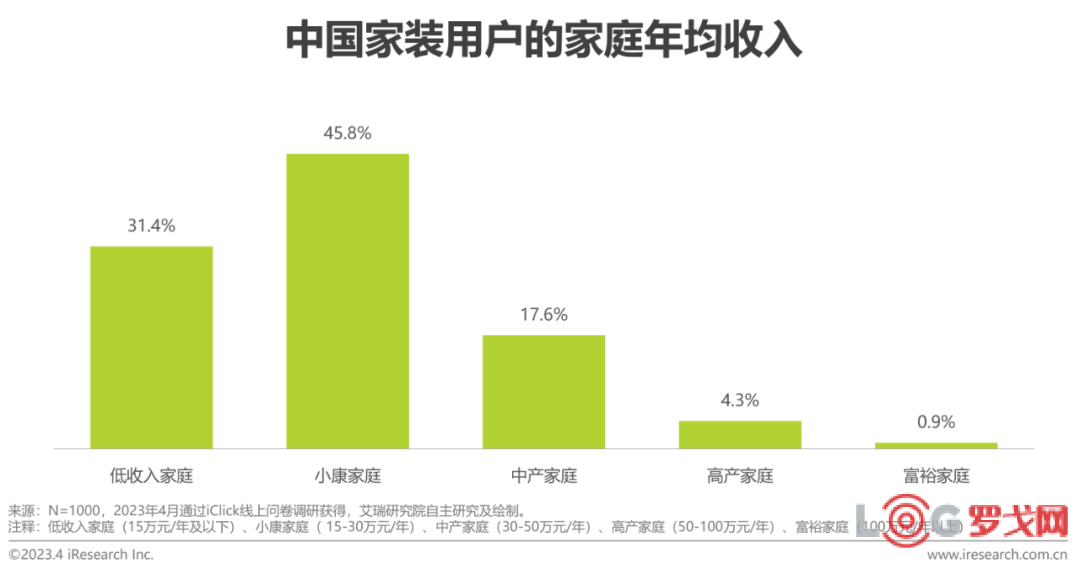 研究表明,我國家裝用戶的居住結構主要以家庭為單位,個人獨居者僅占13.5%,家裝用戶中三成以上為夫妻或戀人同住,另有40%以上為一家三口同住,父母同住和子女同住的用戶占比分別為23.2%和19.4%,三代及以上同住的家裝用戶占比不到10%。從家庭收入的角度來看,接近一半用戶的家庭年均收入達到小康水平,另有22.8%的家裝用戶屬于中產及以上家庭,由此為家裝消費奠定了一定的規模基礎。