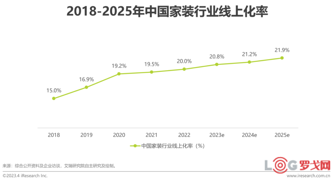 2022年,中國家裝行業的市場規模約為3萬億元,2020年受疫情影響,家裝行業增速開始出現放緩趨勢,但隨著供需兩端雙向驅動以及政策助力,家裝行業未來仍存在較大發展空間。同時,隨著我國互聯網滲透率的不斷提高,家裝行業的線上化水平也隨之持續提升,2022年,中國家裝行業線上化率為20.0%,預計到2025年將接近22%,說明我國家裝行業的線上化消費仍存在一定增長潛力。