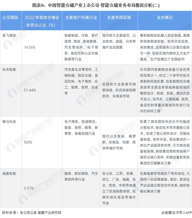 在智能倉儲行業上市公司中,德馬科技、音飛存儲的智能倉儲業務占比較高 ; 在具體業務布局方面,大部分企業的業務類型較為廣泛,客戶類型較多,企業抗單一市場波動的風險較強 ; 在區域布局方面,大部分企業除了深耕國內市場外,均已成功開拓海外市場,以東南亞、歐美地區為主。