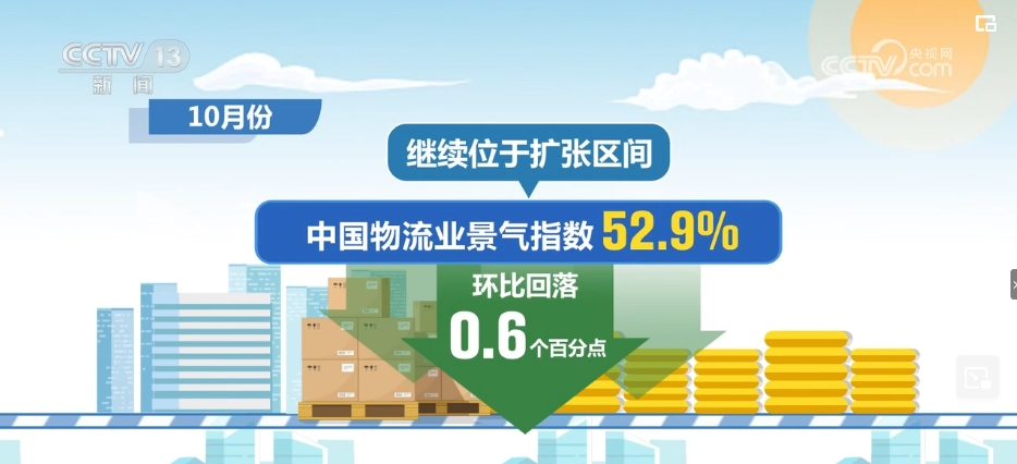 10月份,中國物流業景氣指數為52.9%,環比回落0.6個百分點,繼續位于擴張區間。