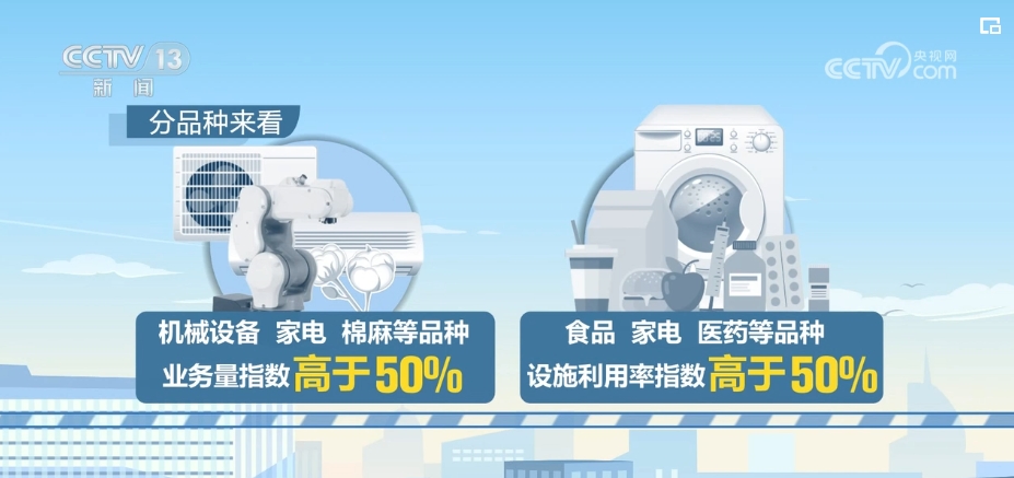 分品種來看,機械設備、家電、棉麻等品種的業務量指數高于50%;食品、家電、醫藥等品種的設施利用率指數高于50%。
