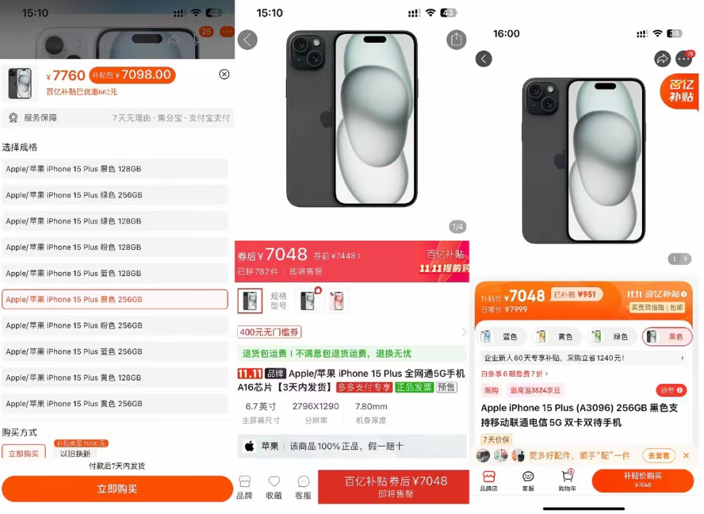 iPhone15 Plus 彩色的128G和256G在淘天百億補貼頻道的價格分別為6098元和6998元,而黑色的價格則分別為6148元和7098元。拼多多同機型彩色價格與淘天持平,但黑色256G為7048元,比淘天便宜50元。