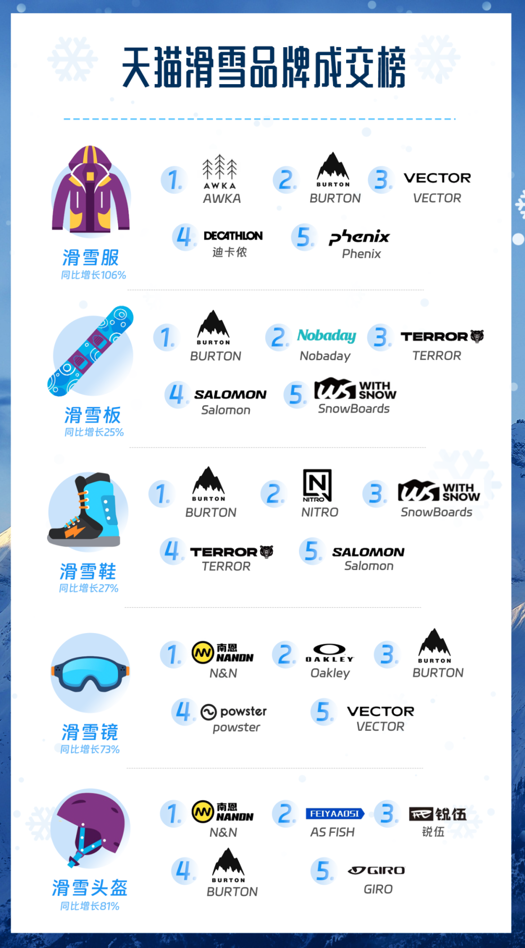 其中部分滑雪領域的資深商家通過天貓快速實現線上化,成功在中國市場打爆。比如被業內稱為“單板之王”的國際滑雪品牌BURTON,就長期在天貓單板滑雪類目占據著第一位。