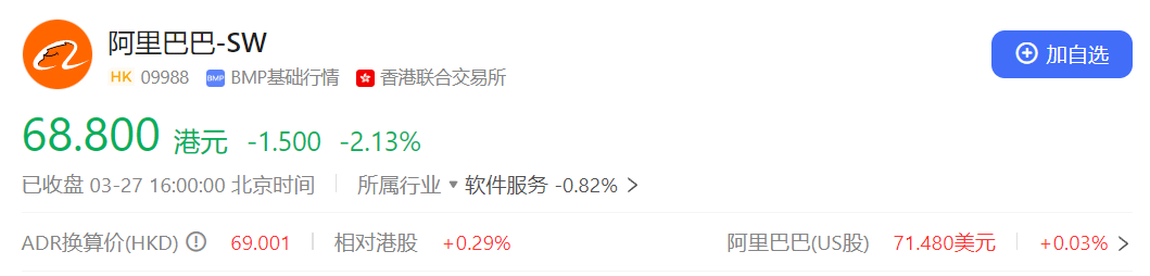 今日(3月27日),阿里巴巴-SW股價下跌2.13%,收報68.8港元。