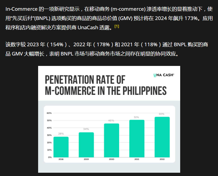 其次,則是先買后付。由于互聯網普及率的提高和在線支付功能的完善,越多越多的菲律賓消費者開始接觸先買后付,并且逐漸習慣使用這一新興的支付方式。去年年底菲律賓金融應用UnaCash發布的一份研究報告就顯示,在過去三年間,菲律賓使用先買后付完成交易的商品總GMV飆升了三位數,而到今年,該國先買后付商品總GMV還將暴漲173%。