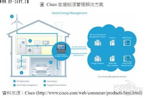 Cisco推出包含“家庭能源控制器(Home Energy Controller,HEC)”與“能源管理服務平臺”的“家庭能源管理解決方案(Home Energy Management Solution,HEMS)”,作為進入家庭節能市場的第一步。HEC如同家庭中的監控中心,除了可以在屏幕上即時顯示家中用電的信息外,使用者通過觸控面板的HEC還可以對連線的家電產品進行操控,決定是否關閉或調整特定家電來節省電力消耗。