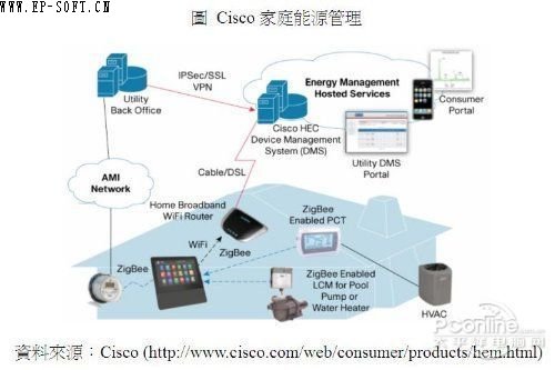 相較于Google PowerMeter,Cisco與Intel所推出產品是以“物聯網(Internet of Things,IoT)”概念為基礎,通過無線網絡模式連結家中各項電器設備,進行用電信息的傳遞與監控,同時進行遠端遙控動作。