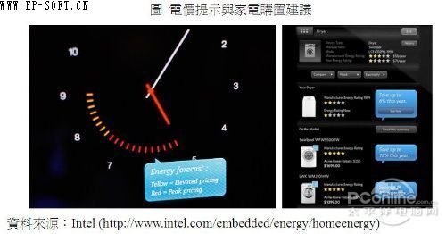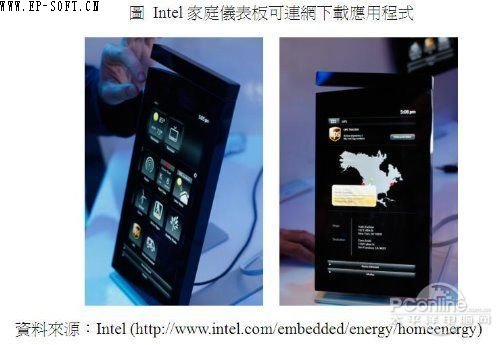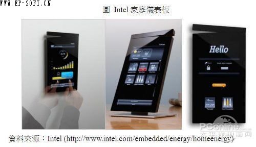 在家庭能源管理的概念下,Intel也推出暫稱為“家庭儀表板(Home Dashboard)”的整合性解決方桉,產品設計為一個具備運算能力且低耗能的平板電腦。Intel規劃此產品成為家庭網絡的核心(Heart of the Home Network),使用者可與智慧家電、智慧插座、智慧電表與家中各項感測裝置進[FS:PAGE]行連結與監控動作,并進行家電設備的安全設定、溫控設定、電源開關等功能。