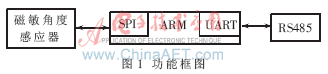 基于磁敏技術的位移傳感器主要由3個部分組成,前端角度信號采集、數據處理單元、數據通訊單元,具體的功能框圖如圖1所示。