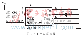 MLX90316具備1路SPI接口,用于角度信號的數據,由于串行通信的輸出信號直接來自于內部DSP輸出,SPI輸出模式更穩定,誤差更小,并且具有更高的抗干擾能力,在本設計中,選用SPI接口,具體的硬件接口連接電路如圖2所示。在圖2中,MLX90316的SPI 3根線與LPC2136的SPI0口連接。SPI(Serial Protocol Interface)總線接口是一種同步串行外設接口。這是一個4根信號線的串行接口協議,包括主、從兩種模式。這4根信號線分別是:時鐘線(SCK)、數據輸入線(MISO)、數據輸出線(MOSI)和從設備使能線(/SS)。