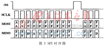 SPI接口中,LPC2136作為主控端,MLX90316作為從屬端。SPI通信模塊主要讓LPC2136讀取MLX90316的磁敏角度,SPI的通信過程為:主控端先輸出一個0xAA以及一個0xFF作為通信起始信號,接著輸出8個0xFF,而從端會同時輸出2個0xFF、4 B的角度信號以及4個0xFF,從而完成一次數據通信。具體的通信時序如圖3所示。
