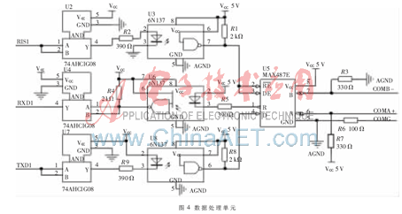 數據通信單元設計了1路RS485通信接口,負責接收來自應用系統的命令、向應用系統返回采集的位移結果。