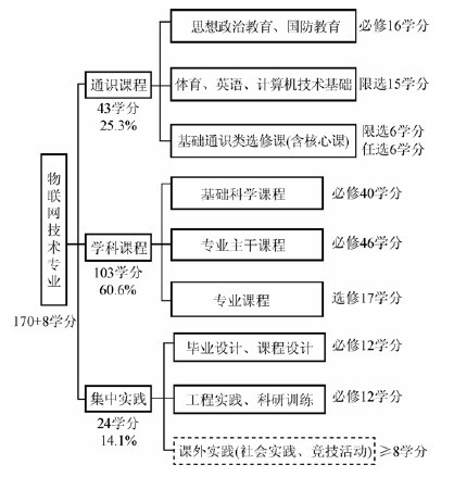 物聯網技術專業的設置需要綜合考慮相關交叉學科的特點,注重課程體系的交叉融合,將相關主干學科的核心課程和專業課程進行通盤考慮。在總學分170學分(教學16學時對應1學分,實驗32學時對應1學分)的情況下,相關課程學分設置如圖1所示,具體課程分類論述如下: