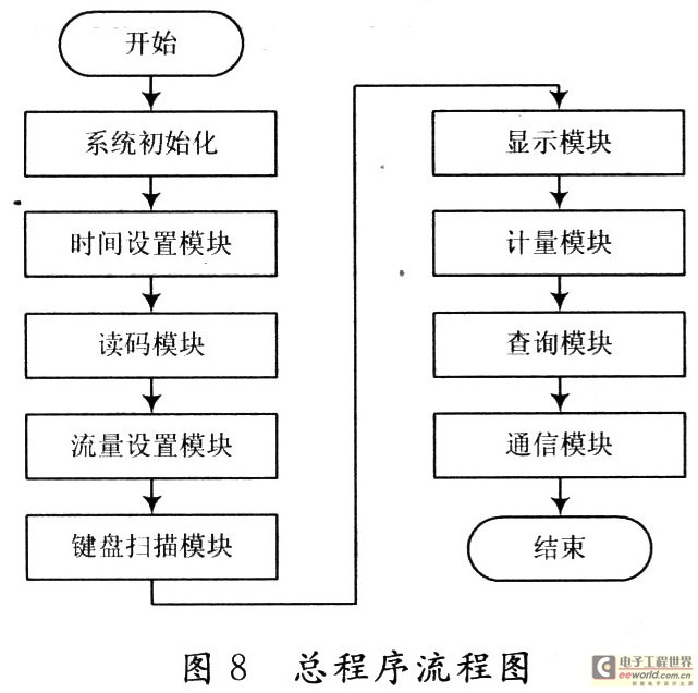 軟件設計采用單片機C語言設計,總程序設計包括:時間設置模塊設計、流量設置模塊設計、計量模塊設計、查詢模塊設計、顯示模塊設計、清零模塊設計、操作鍵設置模塊設計等,其總程序流程圖如圖8所示。