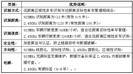 該雙頻技術模式規避了以往單頻標簽管理的自身特性不足,既實現了遠距離區域性多車識別,又達到了近距離目標性單車管理的目的。針對國內出租汽車行業的管理模式分析,采用了有源2.45GHz和無源920-925MHz相結合的雙頻讀寫方式。雙頻電子標簽性能優勢: