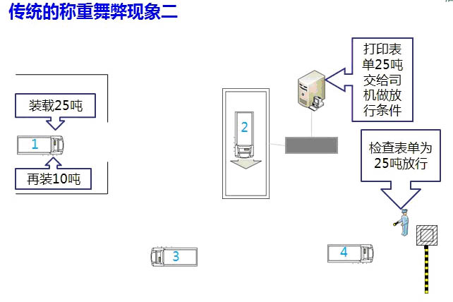 如圖2所示,雖然車輛正確上磅,準確計量出貨物重量,但車輛很快返回倉庫再次裝貨10噸,并繞過再次稱重環節,憑先前開出的《稱重表單》順利出廠,企業不知不覺中損失10噸貨物。