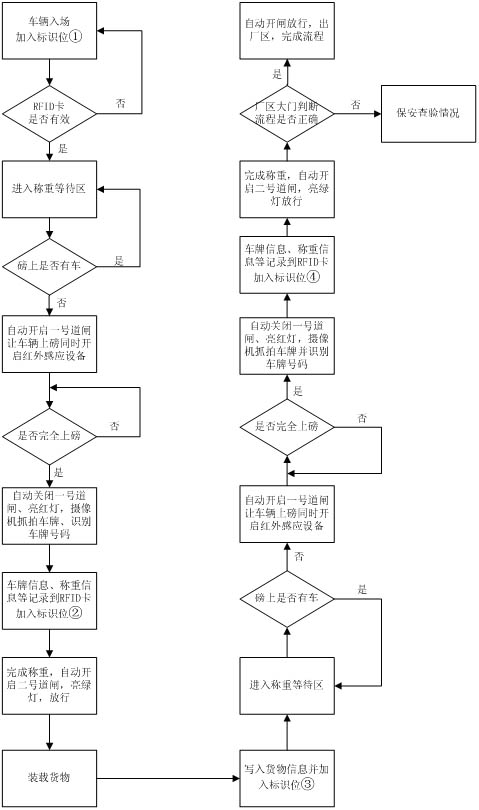 1. 空貨車進廠區,運輸車輛擁有RFID卡,該卡允許進入廠區,加入標識位①后放行。